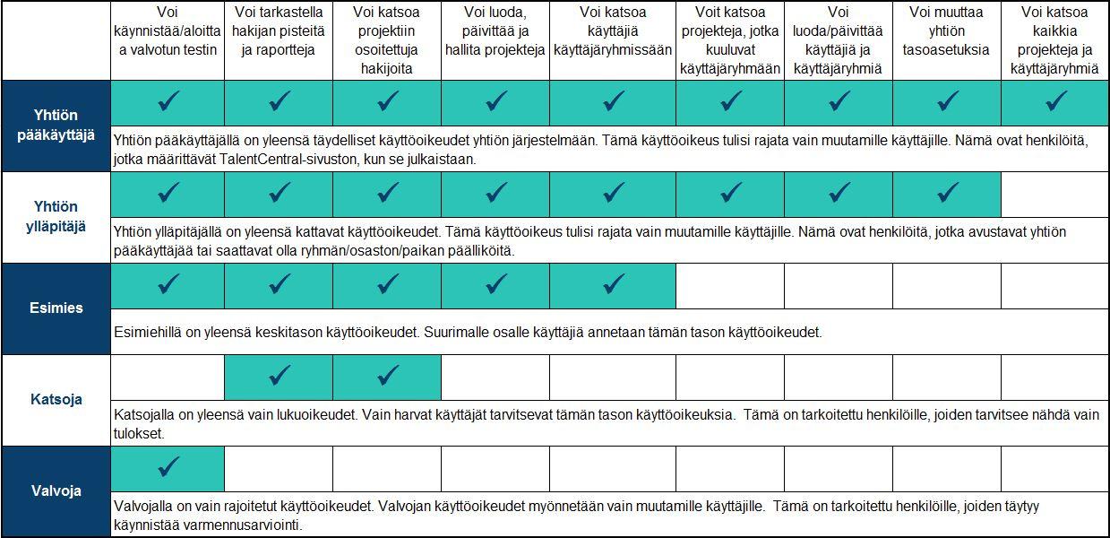 Kun luot uuden käyttäjän TalentCentral™ -arviointialustaan, voit määrittää käyttäjälle myönnettävän käyttöoikeustason. Joitakin käyttäjätasoja, kuten esimiehiä, nimitetään useammin, kun taas valvojat tai katsojat ovat rajoitetumpia ja niitä saatetaan käyttää harvemmin. Yhtiön ylläpitäjän -status pitäisi myöntää vain rajoitetulle määrälle koulutettuja henkilöitä, jotta vältetään tahattomat muutokset yrityksen asetuksiin.