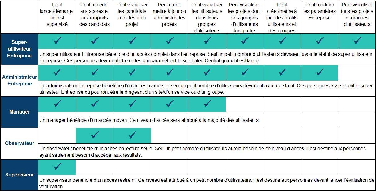 Lors de la création d'un nouvel utilisateur sur la plateforme TalentCentral™, le niveau d'autorisation que vous choisissez détermine le niveau d'accès au système dont disposera l'utilisateur. Certains niveaux d’utilisateurs, comme Manager, seront attribués plus souvent, tandis que Superviseur ou Observateur ont un accès plus restreint et peuvent être utilisés moins fréquemment. Pour éviter des modifications accidentelles des paramètres de votre entreprise, Administrateur Entreprise ne doit être sélectionné que pour un nombre limité de personnes formées.