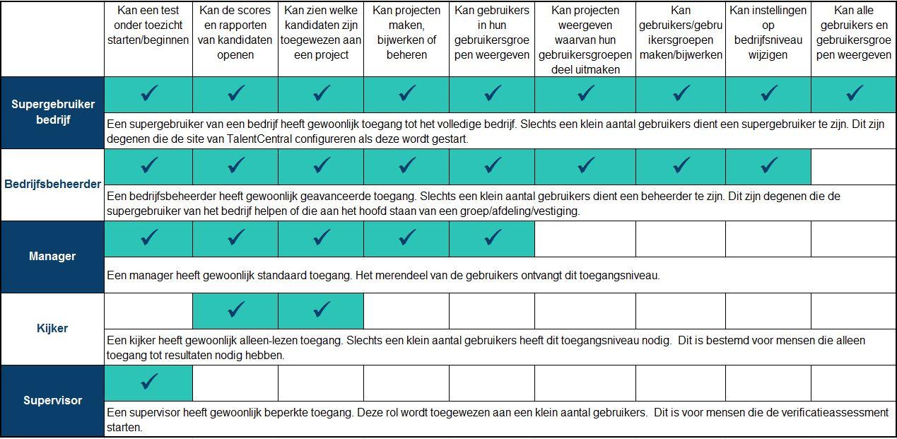 Wanneer u een nieuwe gebruiker aanmaakt op het TalentCentral™-platform, bepaalt het geselecteerde bevoegheidsniveau, het toegangsniveau van deze gebruiker op het systeem. Sommige gebruikersniveaus, zoals Manager, worden vaker toegewezen, terwijl er voor Supervisor of Kijker meer beperkingen gelden, waardoor ze minder vaak worden gebruikt. U kunt onbedoelde wijzigingen aan uw bedrijfsinstellingen voorkomen door Bedrijfsbeheerder alleen te selecteren voor een beperkt aantal opgeleide personen.