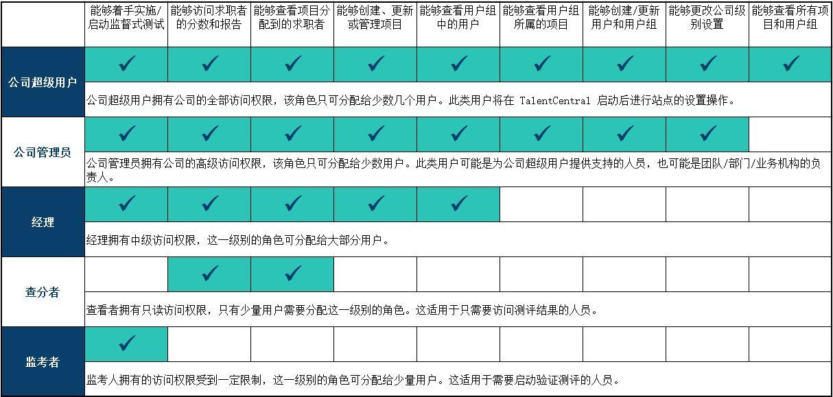 在 TalentCentral™ 平台上创建新用户时选择的权限级别,将决定用户对系统拥有的访问级别。某些用户级别,例如管理者,会更经常被分配任务,而对于监考者或查看者级别,由于权限较少,所以不经常被用。为避免意外更改您公司的设置,仅应为少量受过培训的人员选择 公司管理员用户级别。