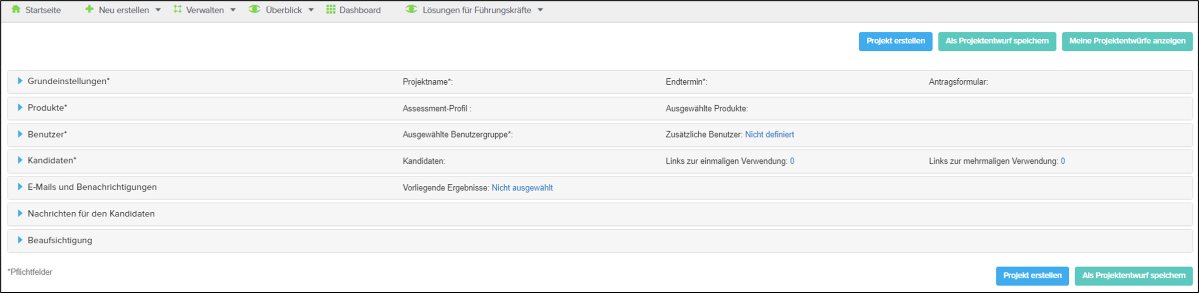 - Erstellen Sie wie üblich ein Projekt und füllen Sie alle Pflichtfelder aus. Wie erstelle ich auf der Plattform TalentCentral™ ein Projekt und versende einen Test?
