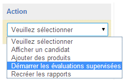 Veuillez choisir Démarrer les évaluations supervisées à partir du menu déroulant intitulé Action lorsque vous êtes prêt(e) à évaluer le/la candidat(e).